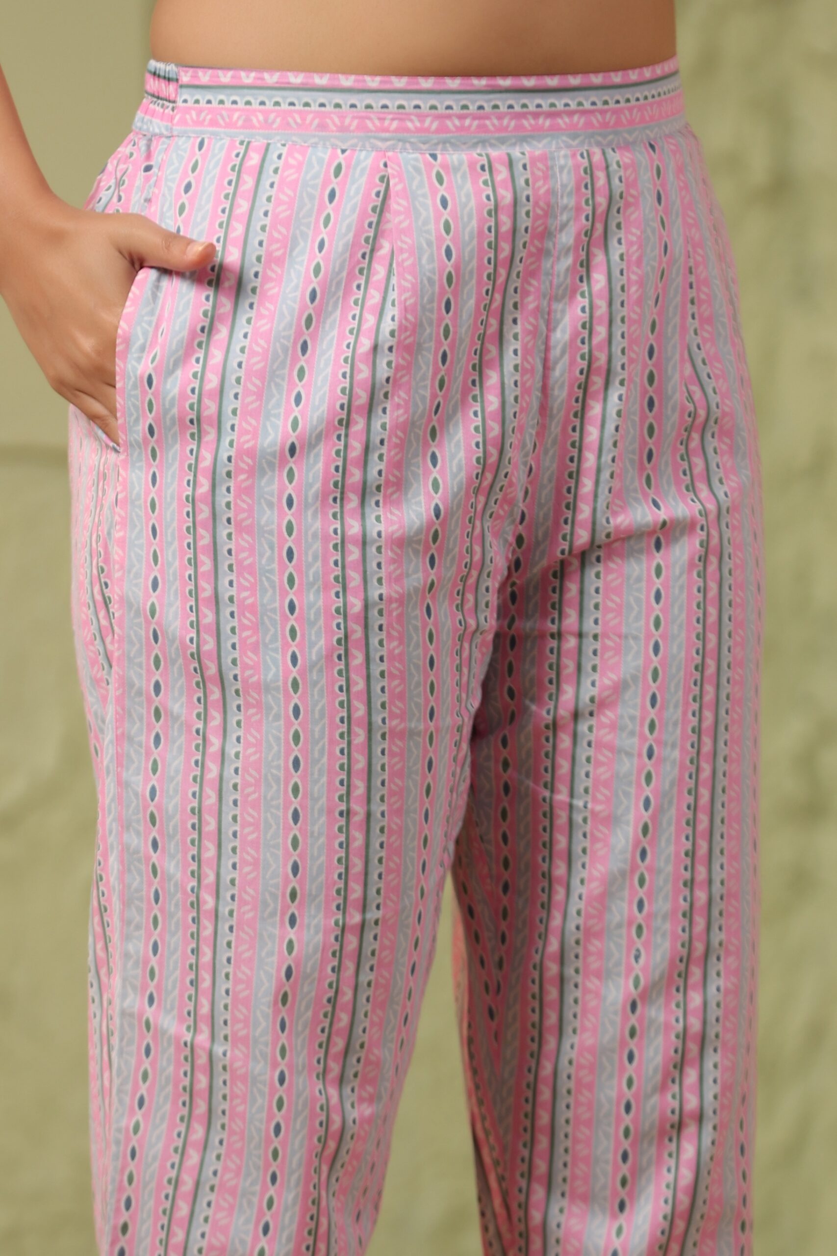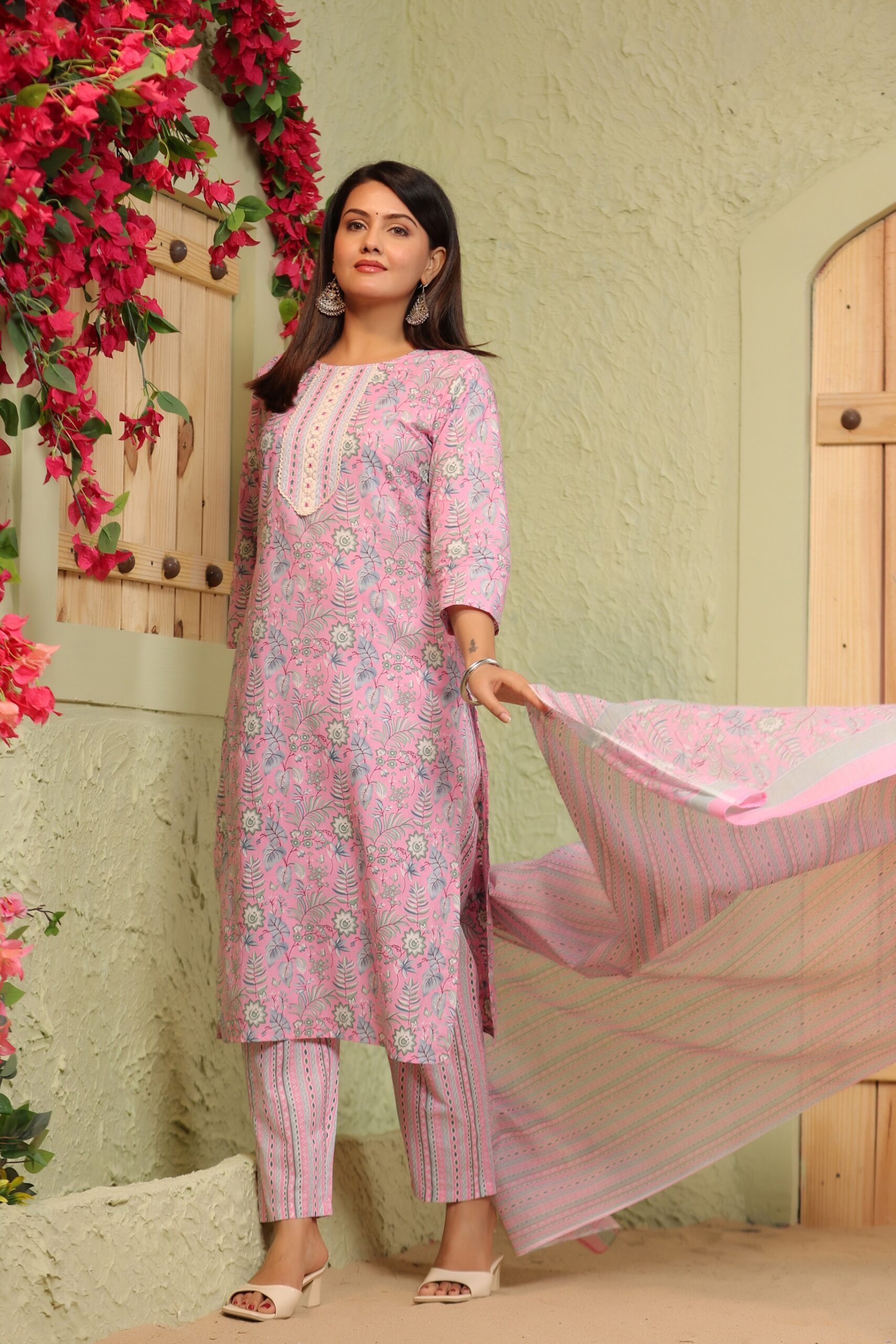 Colour Details: Baby pink kurta paired with matching pink pants and a baby pink dupatta featuring white floral patterns and stripes with a silver border