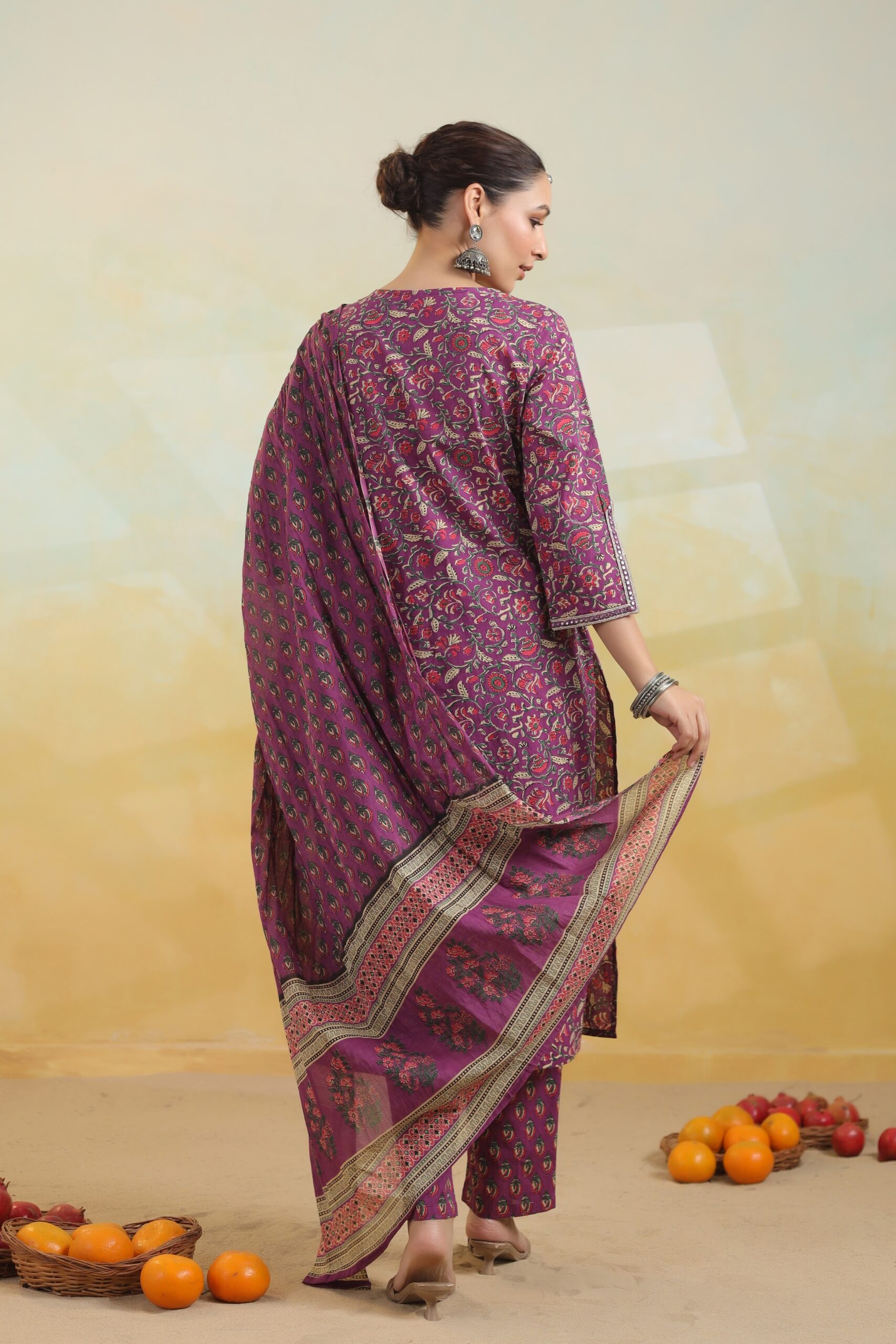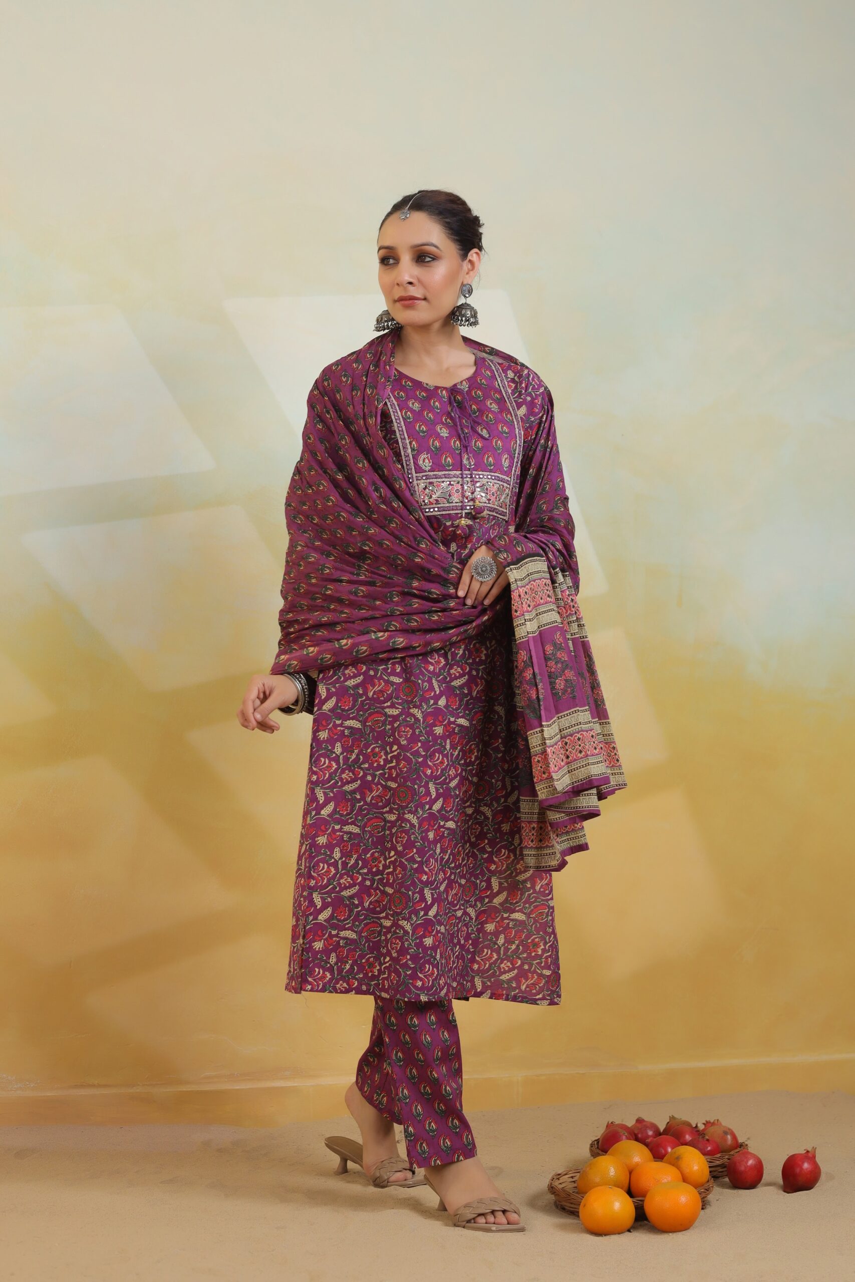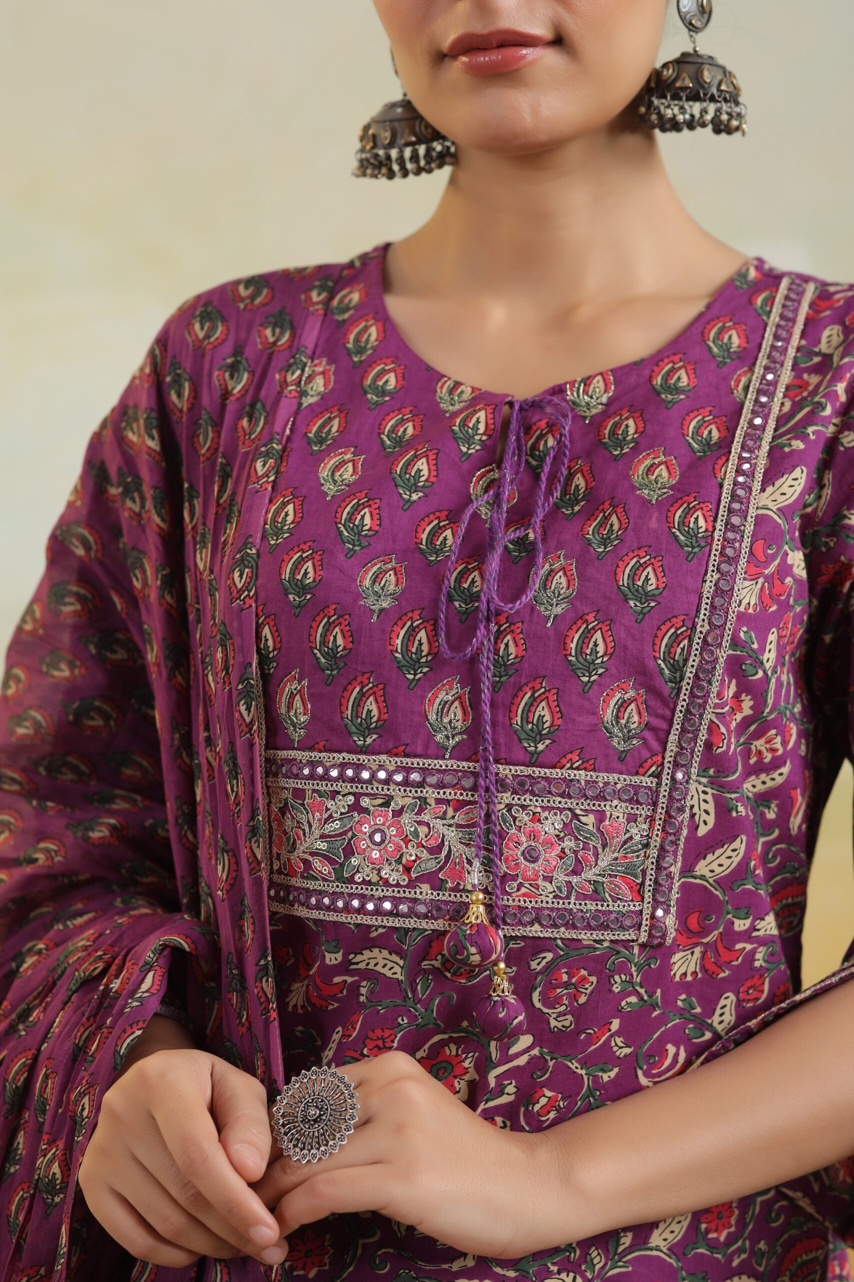 Colour Details: Purple kurta paired with matching purple pants and a dupatta with similar patterns