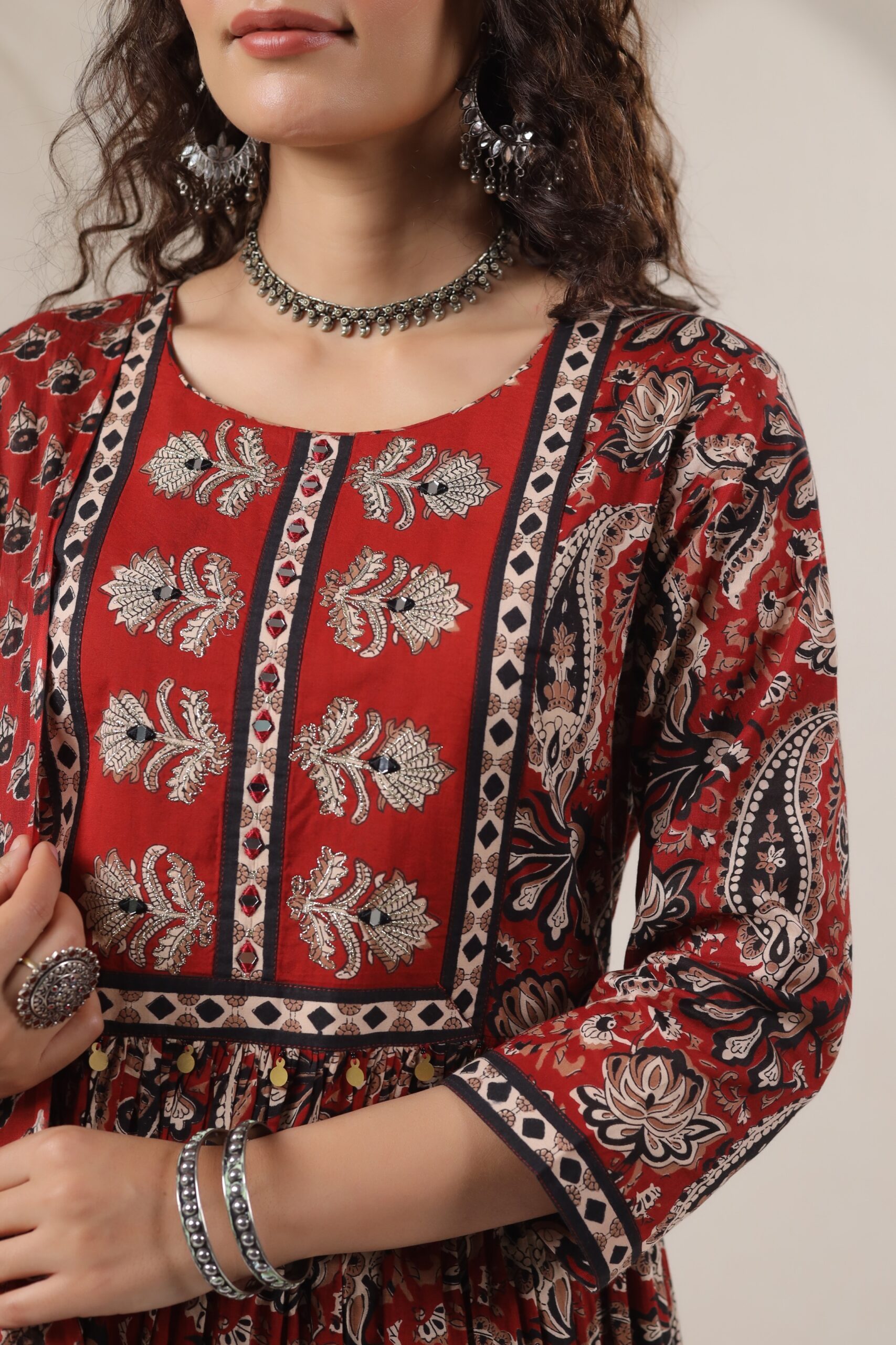 Be the first to review “Red Traditional Cotton Kurta Set with Black and White Paisley and Floral Patterns”